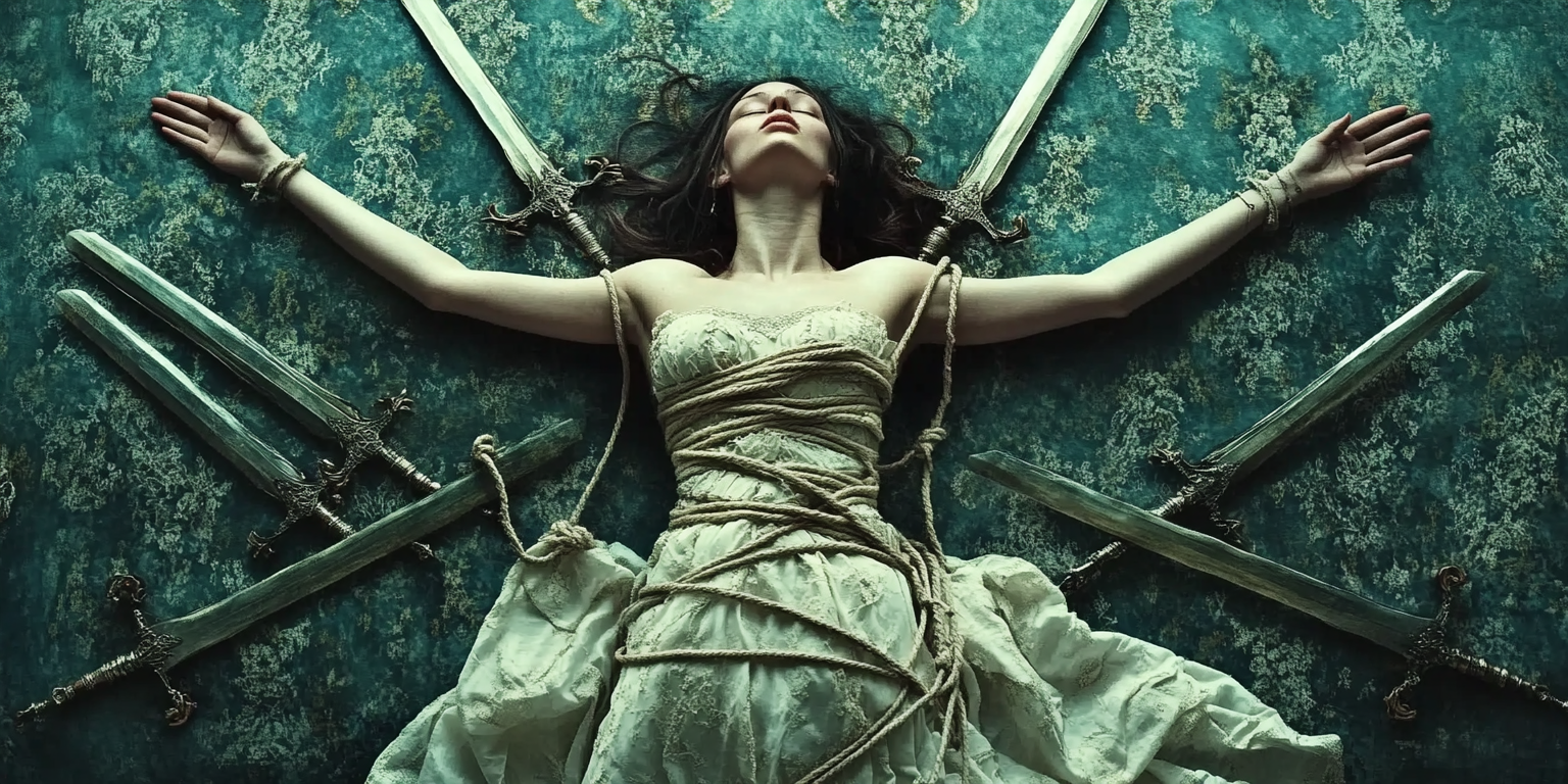 Die Schwerter repräsentieren nicht nur äußere Umstände, sondern auch die Vielzahl innerer, selbst auferlegter Blockaden. Sie zeigen, wie intensiv die Frau von ihren Gedanken und Ängsten dominiert wird.