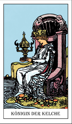 Auf der Karte sitzt eine anmutige Königin auf einem kunstvoll verzierten Thron am Ufer eines Meeres oder Sees. Sie hält einen Kelch in ihren Händen, der oft mit einem Deckel verschlossen ist, was auf ein tiefes Geheimnis oder verborgene Gefühle hinweisen kann. Ihr Blick ist sanft und in sich gekehrt, als ob sie in die Tiefen ihrer Seele oder ihrer Emotionen eintaucht. Ihr Gewand und der gesamte Thron sind mit Wasser- und Meeresmotiven versehen, die ihre tiefe Verbindung zur Gefühlswelt betonen.